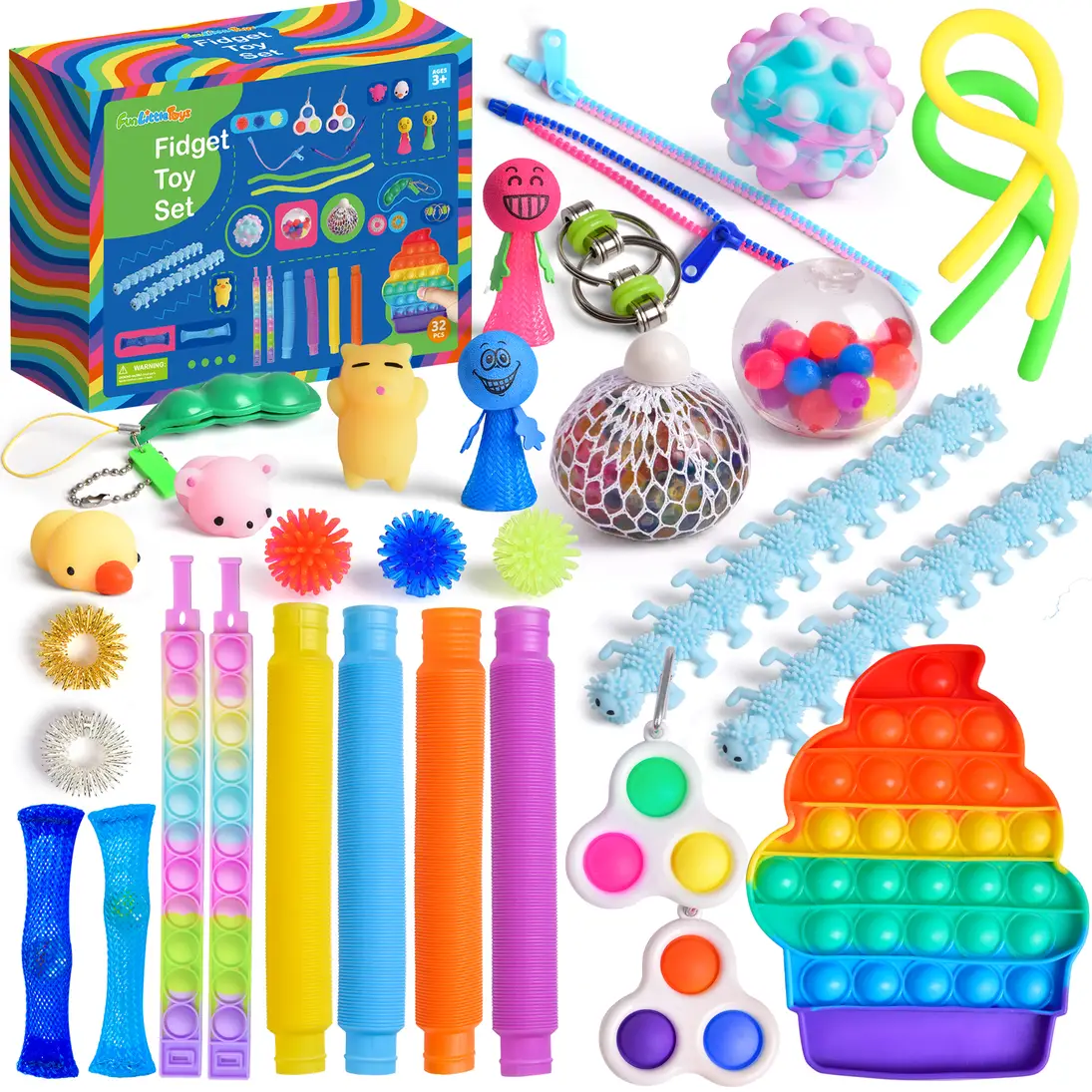 Our fidget set comes packed with an exciting variety of 32 different sensory toys, each carefully chosen to support cognitive development, focus, and stress relief. This extensive assortment includes stress balls, fidget spinners, squeeze toys, textured tactile beads, and many more surprises, promising hours of satisfying sensory play.