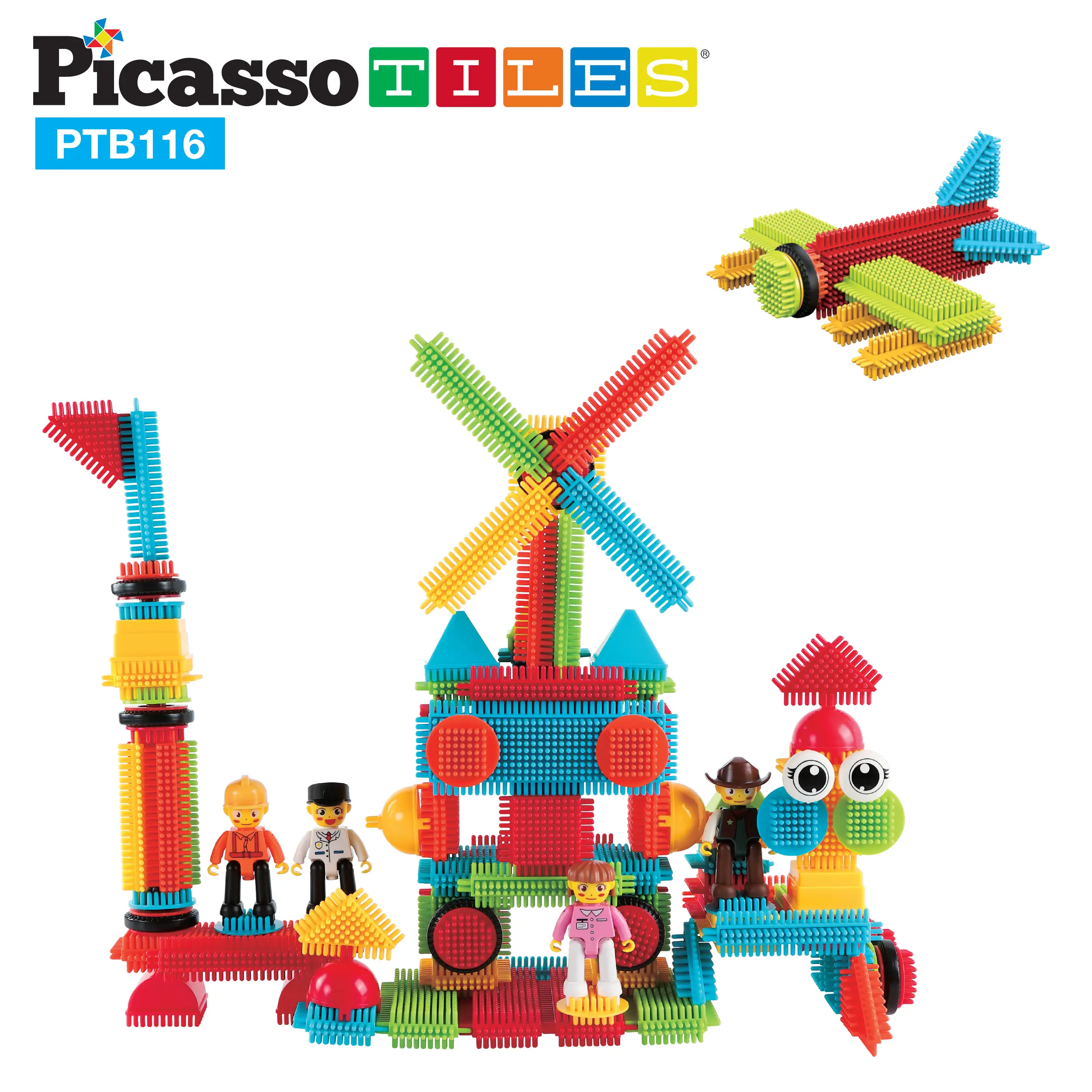 These blocks stick together and are less frustrating and easier for many children to build with. This set comes with blocks, an idea book, 4 characters, and 4 sets of eyes.