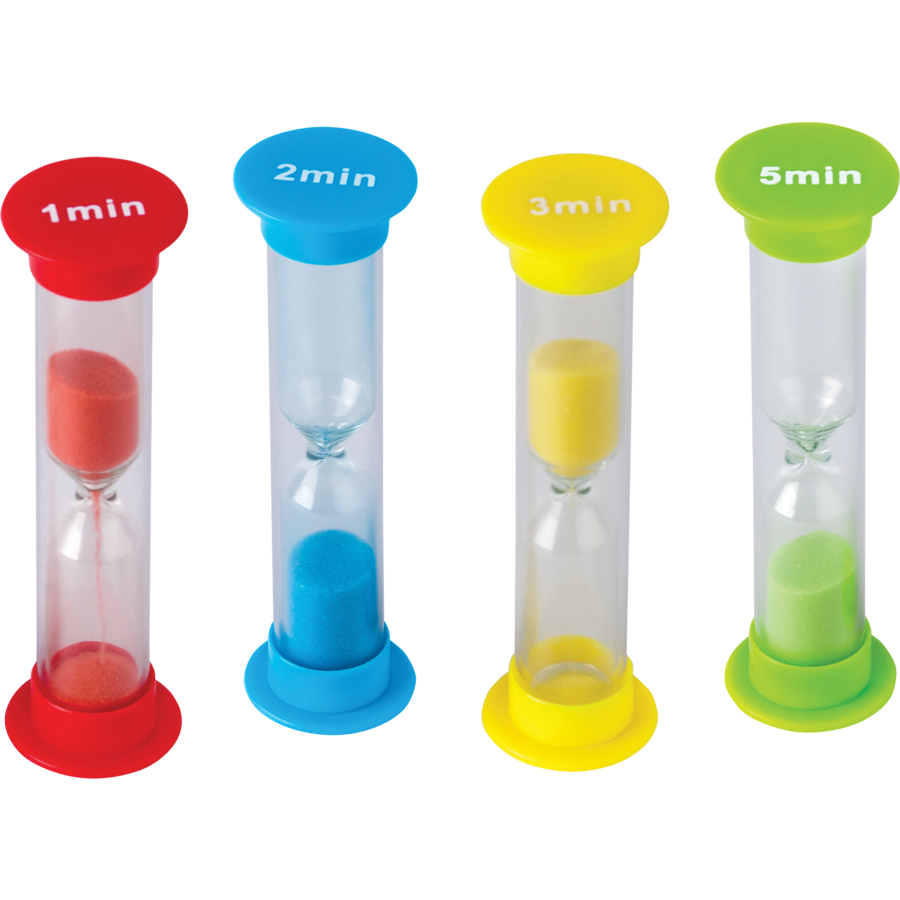 | We can find dozens of uses for these tiny timers. Great for games, time management, breaks, etc. This 4-pack comes with 1 each of 1, 2, 3, and 5 minute timers. Each timer measures 1″ x 3.5.” |