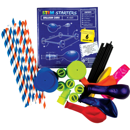 | Attention budding engineers! This kit includes the materials and essential tools to design and build a balloon car. Balloons, plastic nozzles, straws, foam, wheels, and plastic rods are included. Students have to use provided materials to create a moving car. Encourages innovative and creative thinking and problem solving. Includes enough materials for up to 6 cars. Great small group activity for students learning to work cooperatively. |